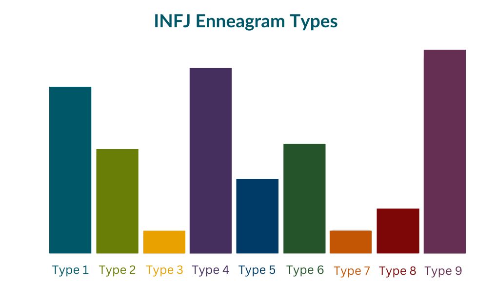 如您所見,INFJ 最常見的是 4 型和 9 型,1 型也相當常見。你還會注意到,民意調查結果顯示,INFJ作為3型和7型的比例相當低,這可能主要是由于內向的方面。